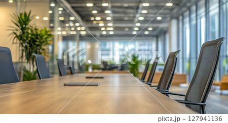 Modern Office Conference Room with Table, Chairs and Natural Light. Collaboration Space, Business Meeting, Workplace Design. Minimalist Interior, Professional Environment, Teamwork Area.