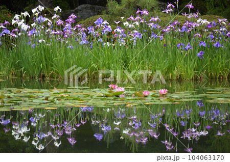 京都市平安神宮神苑の白虎池に映る花菖蒲の水鏡と睡蓮が綺麗