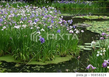 花菖蒲と睡蓮の花咲く京都市平安神宮 神苑