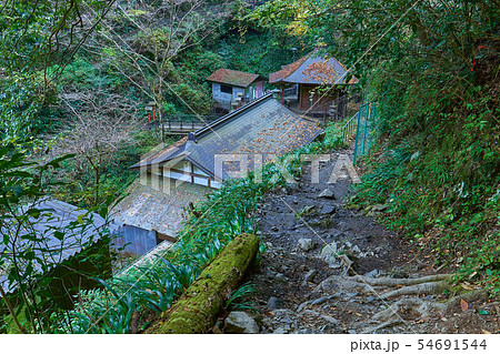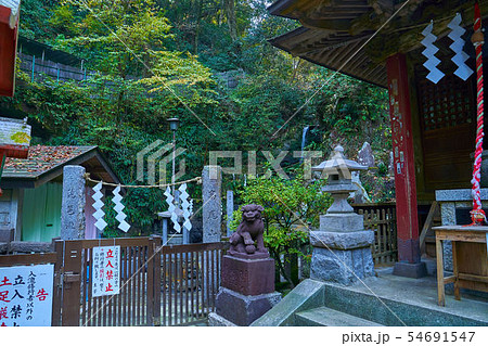 東京八王子市 秋の高尾山にある琵琶滝水行道場を登山道から見る