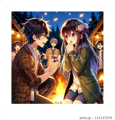 キャンプ場でとつぜんのプロポーズされました 焚火、なかま、友達、夜 漫画 Generative AI