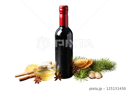 PNG, Mulled wine, bottle of wine with ingredients, isolated on white background