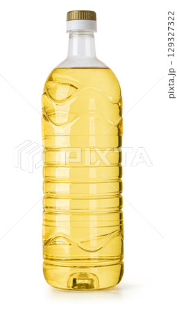 Vegetable oil in plastic bottle filling the entire frame, isolated on white background