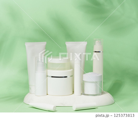 A collection of various white cosmetic containers, including tubes, jars, and bottles, are arranged on a white stand against a light green background with leaf shadows.