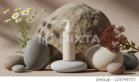 Product bottle on a stone podium with daisies and natural elements. Natural organic product display for cosmetic or beauty brand promotion.