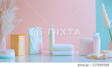 Group of plastic bodycare bottle Flat lay composition with cosmetic products on colored background empty space for you design. Set of White Cosmetic containers, top view with copy space