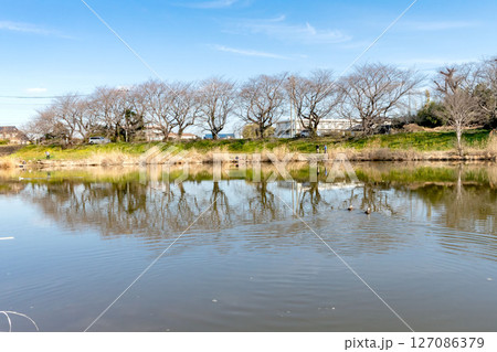 冬景色 青空の雑木風景 びん沼川湖畔 さいたま市
