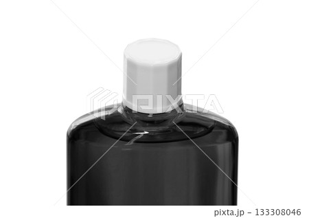 【切り抜き透過背景素材】スクリューキャップを閉めた育毛剤の黒色半透明のボトル