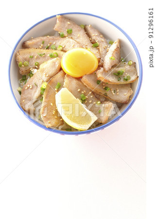 カットレモンと卵黄が乗った豚トロ丼、焼き肉丼を白背景で俯瞰撮影
