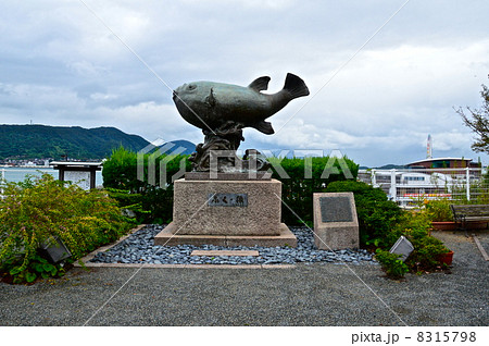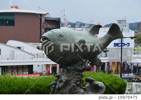 下関市の亀山八幡宮境内にあるふくの像と関門海峡