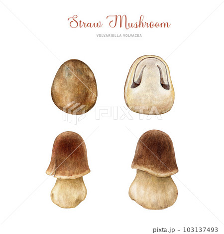 Fresh straw mushroom set. Watercolor illustration. Hand painted Volvariella volvacea fungi close up detailed illustration. Straw mushroom asian cuisine element. White background