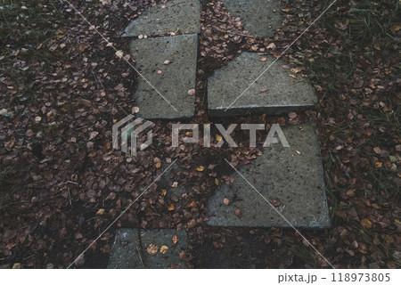 Old paving slabs sticking out of the ground covered with dry foliage