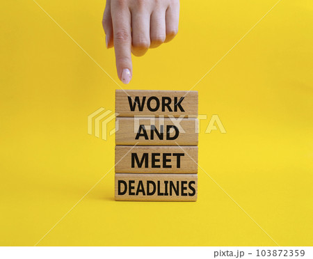 Work and deadline symbol. Concept words Work and meet deadlines on wooden blocks. Beautiful yellow background. Businessman hand. Business and Work and meet deadlines concept. Copy space.