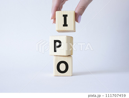 IPO- Initial Public Offering symbol. Concept word IPO on wooden cubes. Businessman hand. Beautiful white background. Business and IPO concept. Copy space.