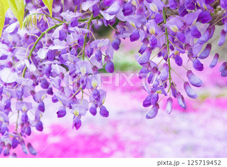 ふじの咲く丘の春を彩る花々 5月の主役藤の花を背景にシバザクラが歩道を埋め尽くす光景