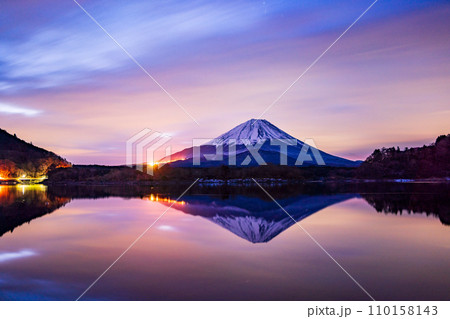 (山梨県)精進湖から望む富士山(ふじてんスノーリゾート深夜の灯り)