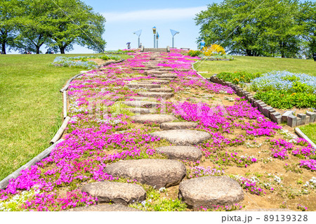 ふじの咲く丘の春を彩る花々 赤い一輪のチューリップとシバザクラの中を歩ける歩道