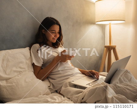 Happy woman with headphones using a laptop in a cozy living room with food and drink. Perfect for themes