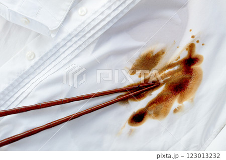 White shirt stained with soy sauce and chopsticks lying on it, no people, close-up , selective focus,