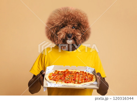 A person wearing a bright yellow t-shirt proudly holds a large pizza with various toppings in front of them. The head of the individual is humorously replaced by the fluffy face of a dog