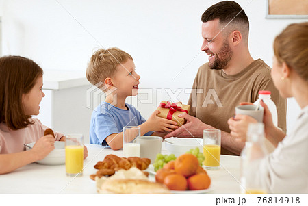Mom with children congratulating dad with Fathers day while having breakfast in kitchen