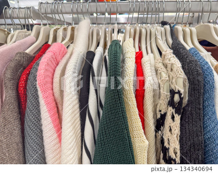 Colorful knit sweaters arranged on rack in modern clothing store interior