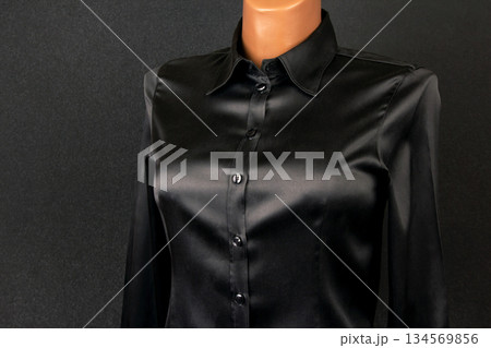 Elegant satin blouse on display with detailed buttons and a smooth finish