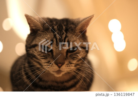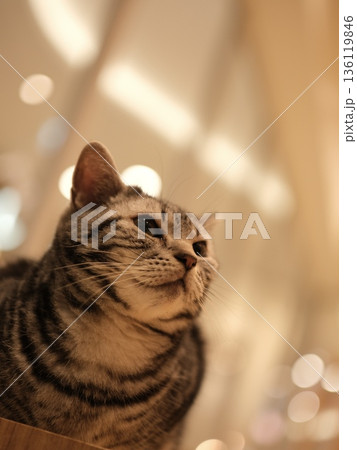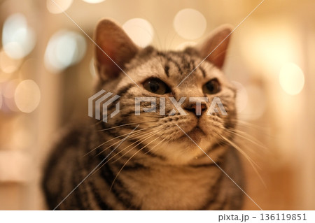 こちらを見つめてじっと座るサバトラ猫のアップ