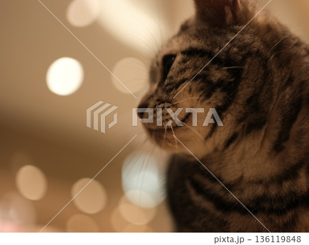木箱の中で外を見つめるサバトラ猫の斜め顔