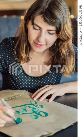 Calligrapher Young Woman writes phrase on white paper. Go green. Inscribing ornamental decorated letters. Calligraphy, graphic design, lettering, handwriting, creation concept VERTICAL FORMAT for