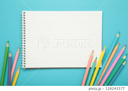 School supplies on blue background. Back to school concept. Top view. Copy space.