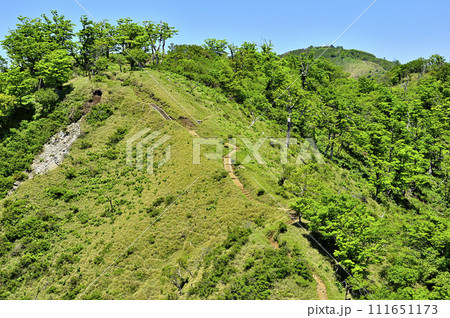 丹沢の不動ノ峰より望む箒杉沢ノ頭 草原の樹走路が続く登山道