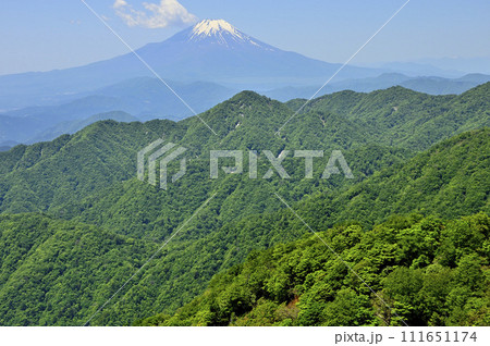 丹沢の不動ノ峰より望む初夏の富士山と緑の山地