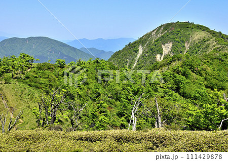 丹沢主脈の縦走路 草原の不動ノ峰より望む緑の丹沢山