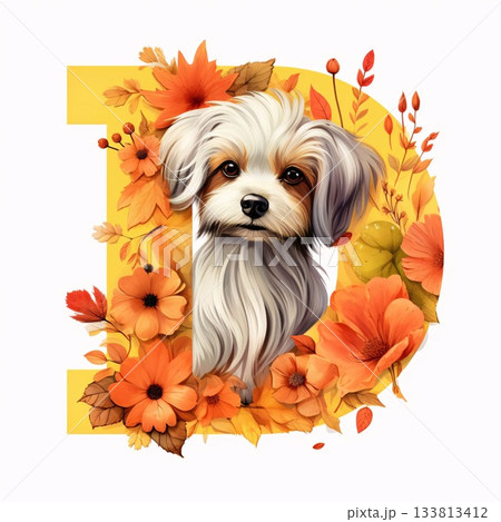 English alphabet letter D with cute dog and autumn flowers. Lettering can be used as a greeting card.