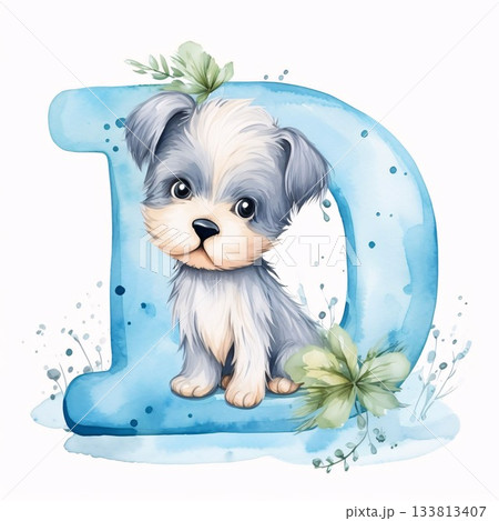 Cute puppy with letter D, watercolor illustration, isolated on white background