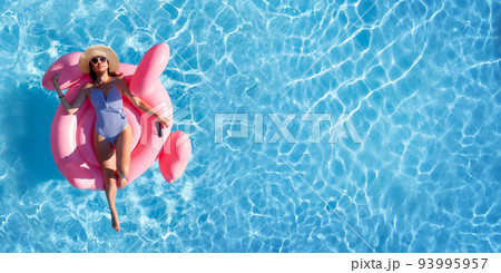 Woman relaxing on pink flamingo inflatable ring