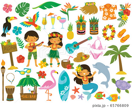 Tropical clipart set. Hawaii, hula dancers, Beach items and summer cartoons.