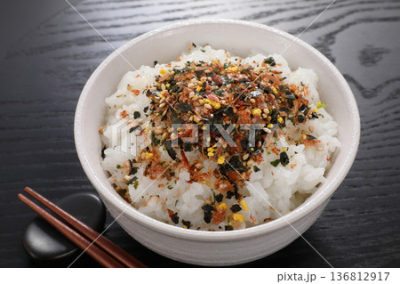 ふりかけをかけたご飯 鰹とたまごのふりかけご飯 ご飯の友 ご飯のお供 食文化 イメージ素材