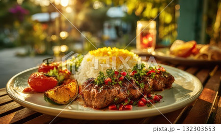 Grilled meat kebabs garnished with pomegranate and herbs served with rice, vegetables, and grilled citrus on a sunlit outdoor table setting. Perfect for summer dining and Mediterranean cuisine
