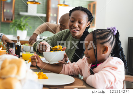Happy african american mother serving food for daughter at thanksgiving dinner