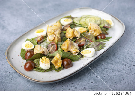 Warm salad with rapan (snails), tomatoes, cucumbers, leafy vegetables, quail eggs and olive oil. Traditional seafood salad. Close-up, selective focus.