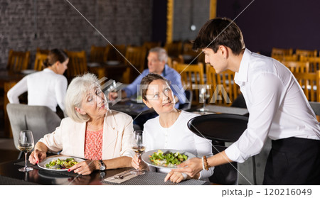 Young waitress serving dishes to female guests in restaurant