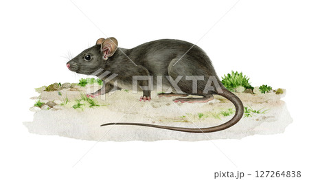 Black rat animal on the ground realistic watercolor illustration. Rattus Rattus wildlife rodent mammal hand drawn vintage style image. Cute small single black rat side view standing on the ground