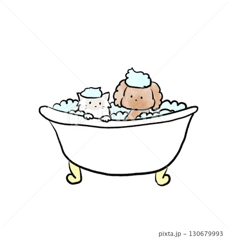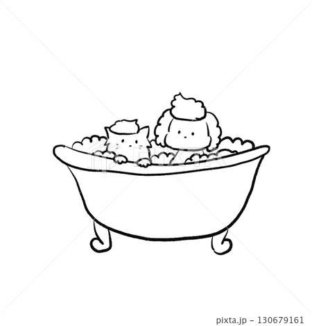 お風呂に入っている線画の犬と猫
