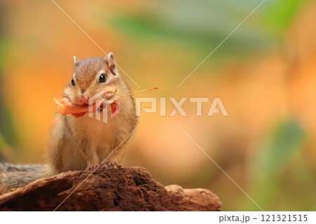 落ち葉をくわえるエゾシマリス