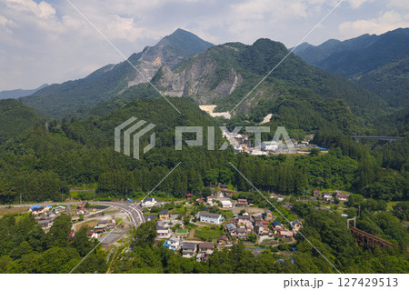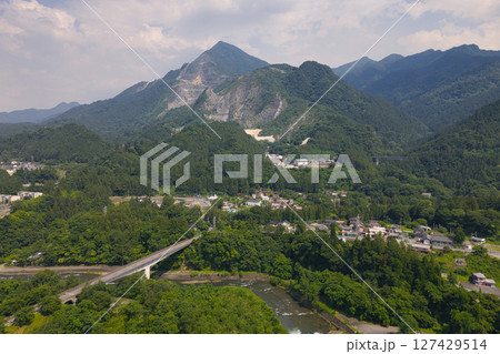 荒川・久那橋と武甲山の雄大な眺め 埼玉県秩父市(ドローンによる空撮)