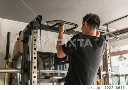 スポーツジムでマシンを使って鍛える男性(懸垂)