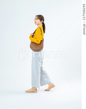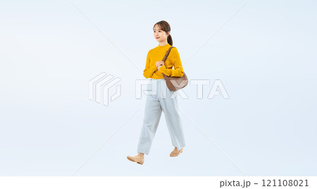 歩くカジュアルウェアの女性の全身写真