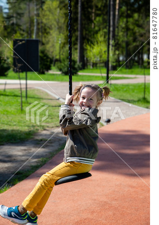 Little girl in sunglasses swings on a rope swing at the playground. High quality photo